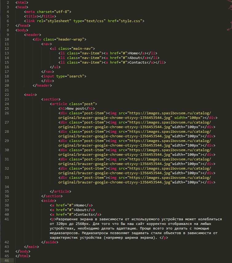 СТР 22-43 далее мы указываем тег main (основное содержимое сайта). В этот раздел мы помещаем тег section внутри которого находится тег article (тоесть внутри секции блок со статьей, в нашем случае это пространство будет заполнено картинками)
